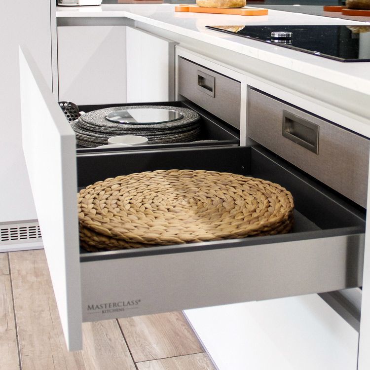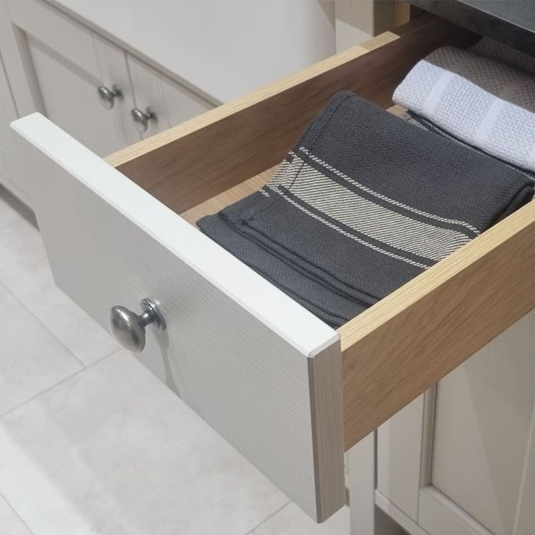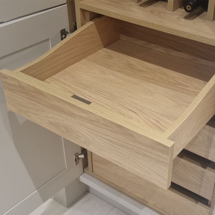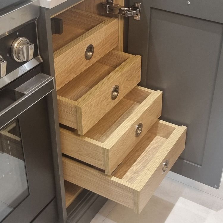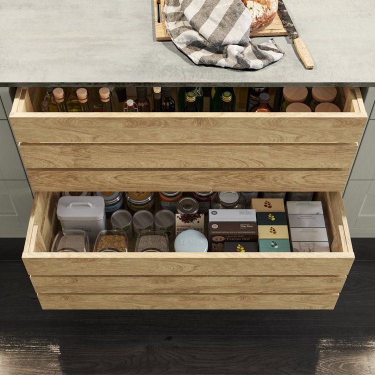 Kitchen drawers are available in three box drawer types – Portland Oak, Tuscan Walnut and modern Legrabox R-Designs – but we offer a lot more variation! Pridefully crafted for long-term use, these options cover unique sub-options, including:
