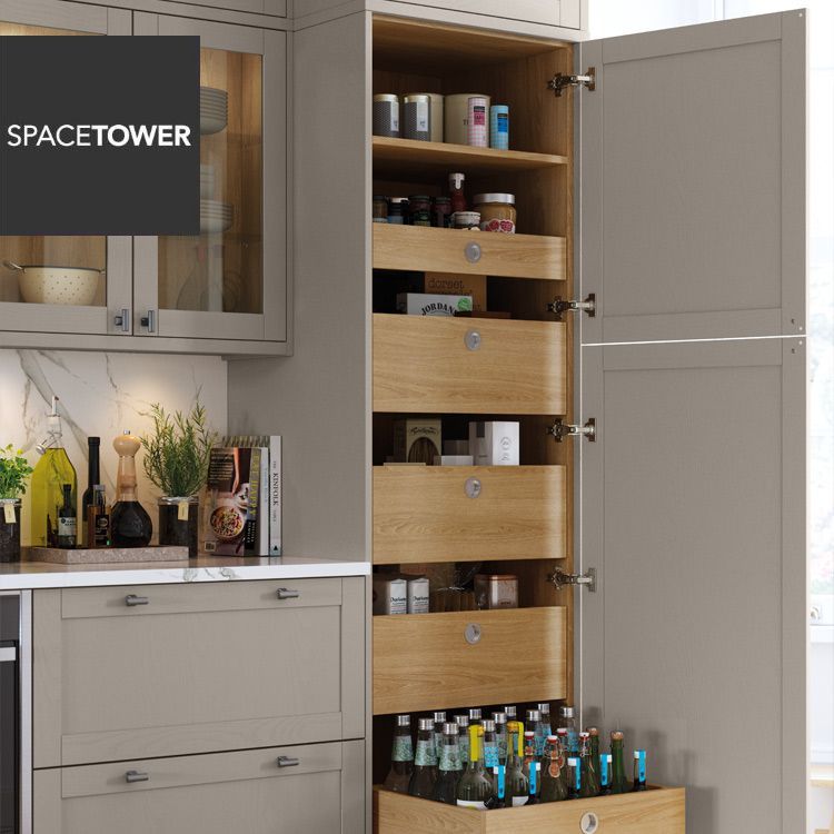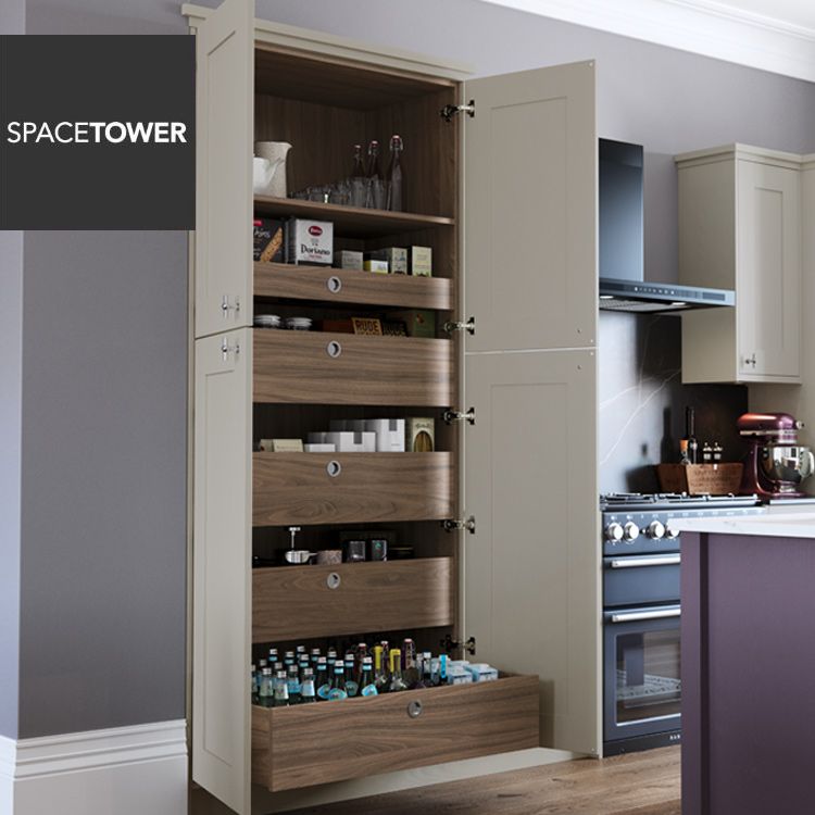 Introducing our SpaceTower larder unit – a vital option for anyone who needs a wealth of spacious, accessible drawers for ingredients, all neatly hidden behind high-quality doors.