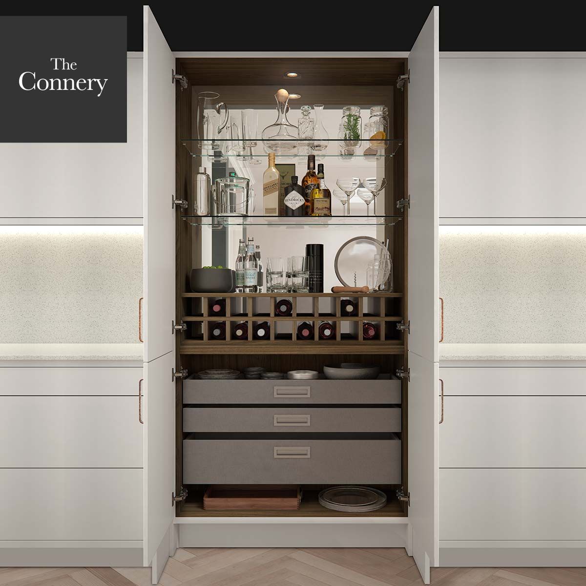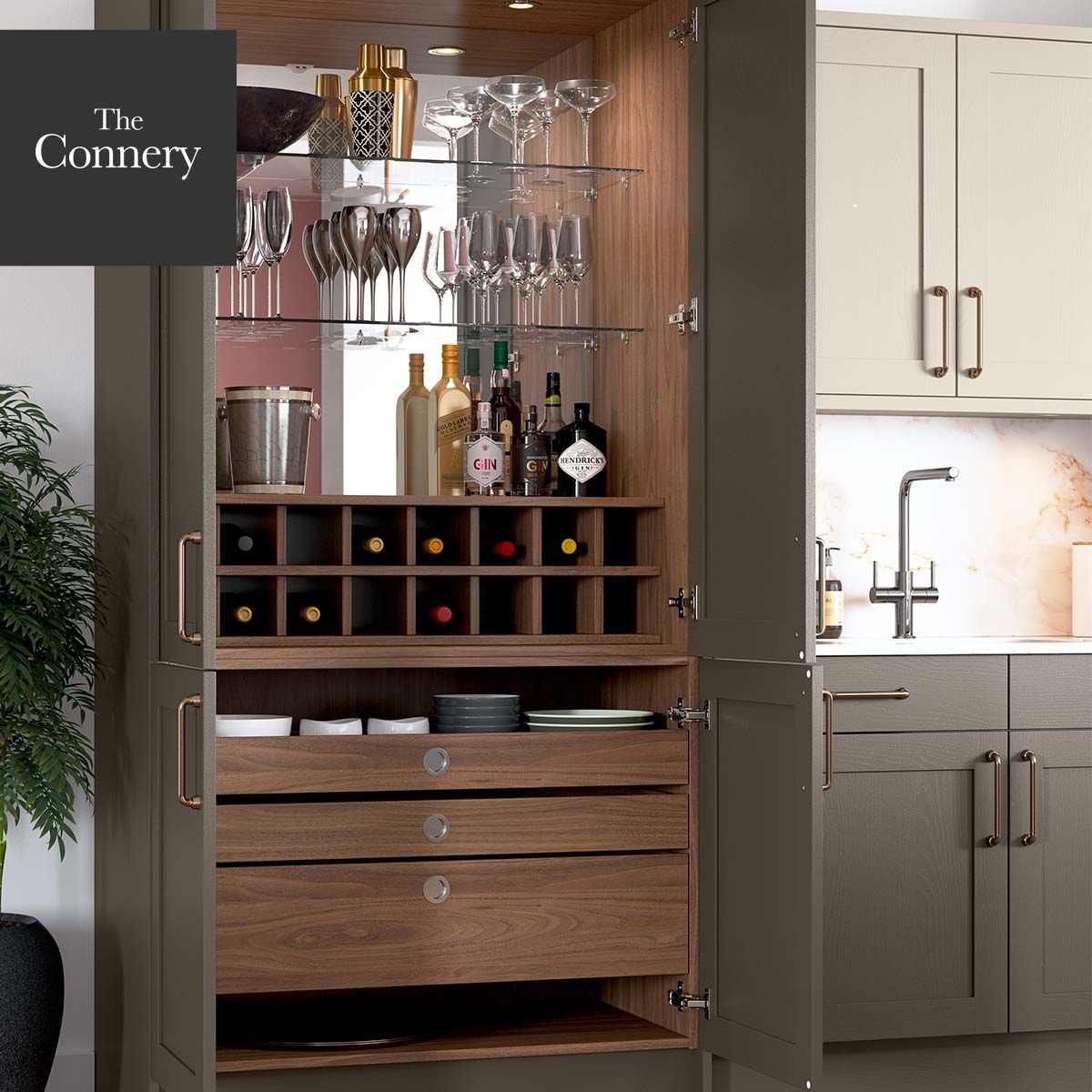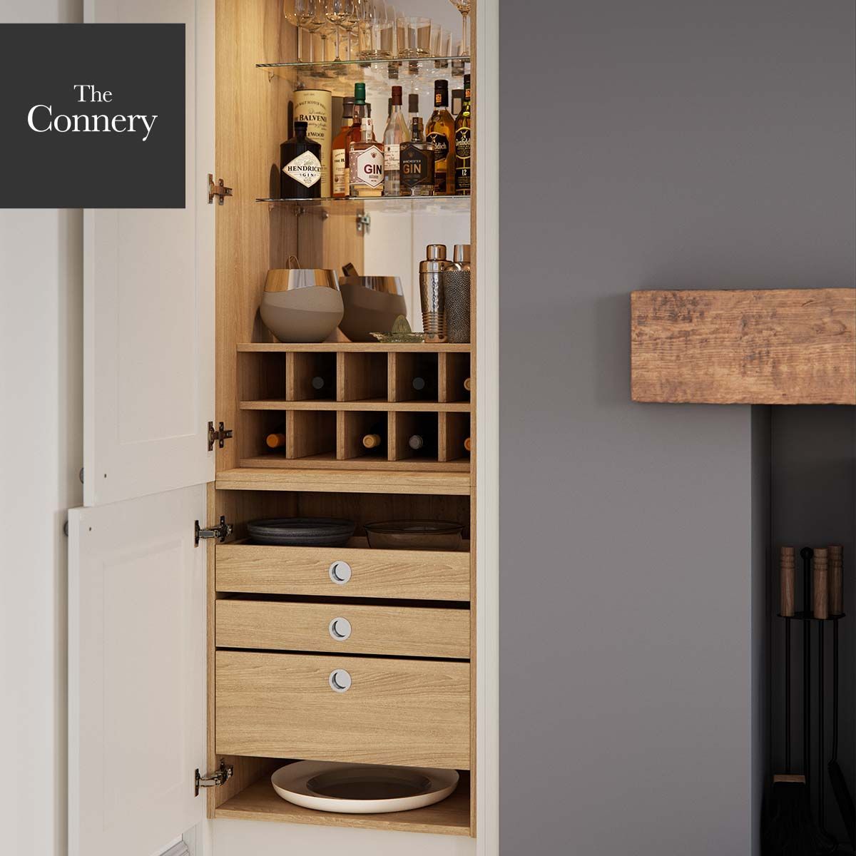 Available in Portland Oak and Tuscan Walnut, this tall drinks cabinet adds class to every kitchen it inhabits. Briming with world-class craftsmanship, it encourages conversation after dinner parties or a full day of business. The Connery leaves even glass-half-empty drinkers in high spirits